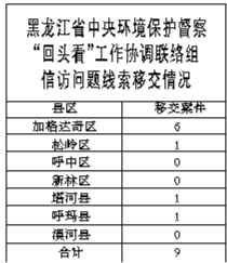截至6月20日,我区共接收黑龙江省中央环境保护督察“回头看”工作协调联络组移交信访问题线索9件,其中加格达奇区6件,松岭区1件,塔河县1件,呼玛县1件。目前已经办结完成5件,4件正在办理中。